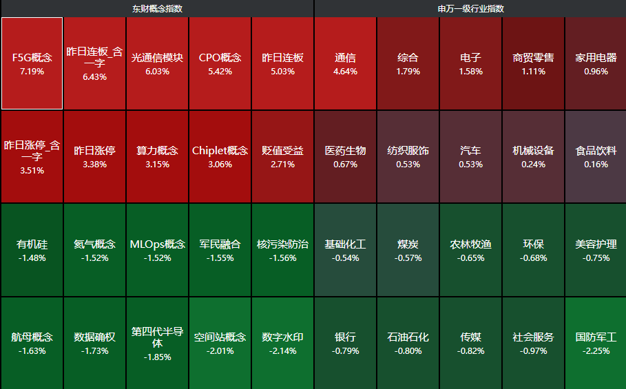 分行业来看,通信、综合、电子、商贸零售、家用电器等行业领涨,国防军工、社会服务、传媒等行业领跌。