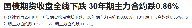 国债期货收盘全线下跌,30年期主力合约跌0.86%。