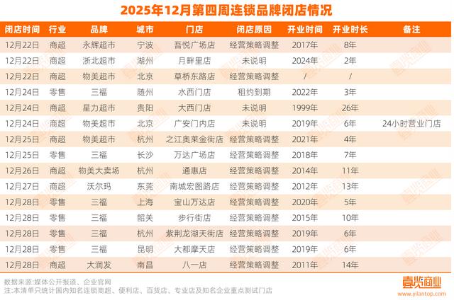 据壹览商业不完全统计,12月第四周,国内知名连锁商超、便利店、百货店、专业店及知名企业重点测试门店,共有7个连锁品牌关闭了至少15家门店。