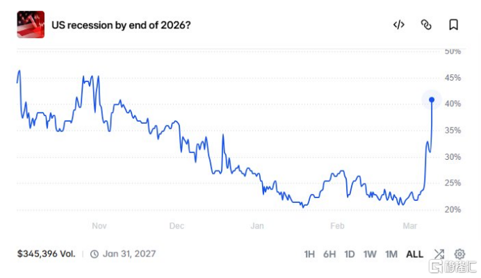 目前,预测平台Polymarket显示,2026年底前美国发生经济衰退的概率飙升至41%。