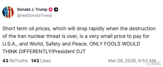 周日,特朗普在“真实社交”平台发文称,“伊朗核威胁消除后短期油价将迅速下降”,他强调对于美国乃至世界的安全与和平而言,“代价微不足道”。