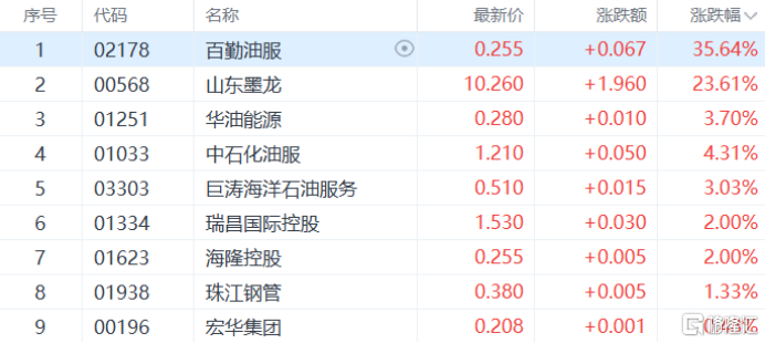 港股中,百勤油服涨超35%,山东墨龙涨超23%,中石化油服、华油能源等多股跟涨。