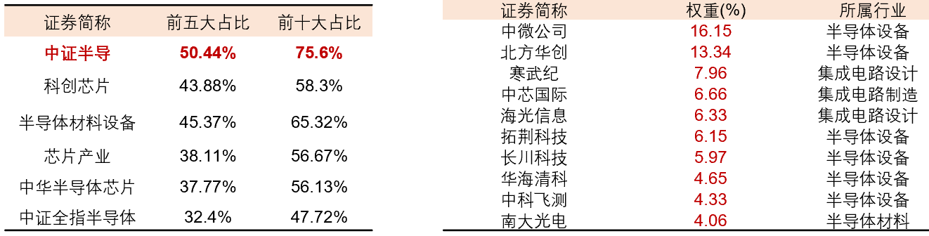 半导体设备ETF(561980)跟踪中证半导,标的指数中“半导体设备+材料+AI芯片设计”三行业占比超90%,重点覆盖中微公司(刻蚀设备)、北方华创(多领域设备)、中芯国际(制造龙头)、海光信息、寒武纪(AI芯片设计)、南大光电(半导体材料)等核心国产替代领域龙头,前五大集中度、前十大集中度在同类可比半导体指数中均位居第一。