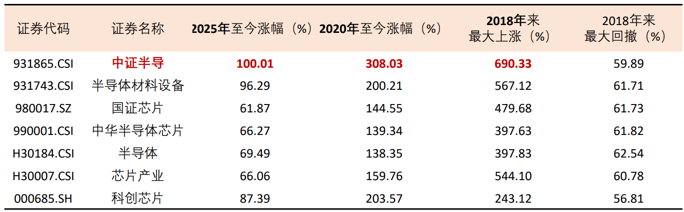 由于对龙头高度聚焦,该指数较同类指数呈现更高弹性——对比科创芯片、半导体材料设备等同类主题指数,中证半导2025年至今涨幅率先实现翻倍,2020年至今上涨308%、大幅跑赢科创芯片指数超100%,且上一轮半导体周期(2018年)至今最大涨幅超690%,均在同类指数中位居第一。