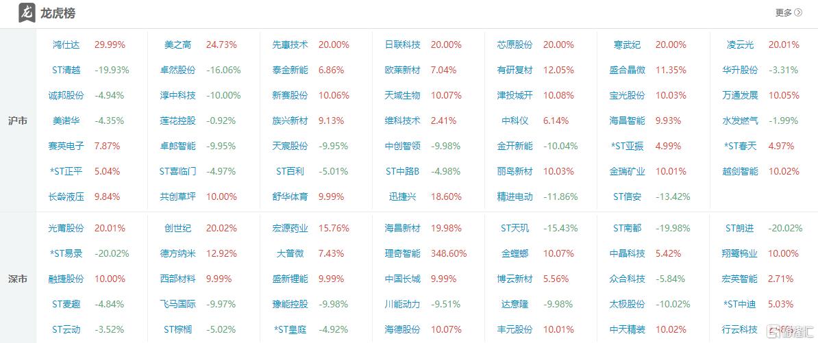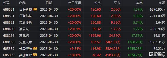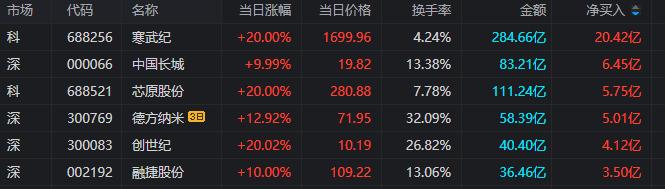 龙虎榜单日净买入额前三为寒武纪、中国长城、芯原股份,分别为20.42亿元、6.45亿元、5.75亿元。