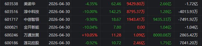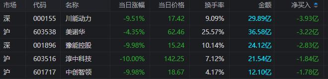 川能动力:下跌9.51%,换手率9.09%,成交量167.75万手,成交额29.89亿元。龙虎榜数据显示,机构合计净卖出2.96亿元,北向资金合计净卖出1.5亿元。