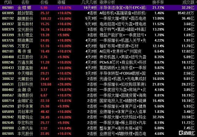 焦点股方面,商业航天叠加半导体洁净室概念的金螳螂走出10天8板,织布机概念股越剑智能4连板,氦气概念股宝光股份3连板,锂电产业链的永杉锂业3连板。