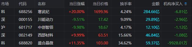 龙虎榜中涉及机构专用席位的个股中,单日净卖出额前三为寒武纪、川能动力、中创智领,分别为6.81亿元、2.96亿元、1.12亿元。