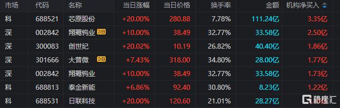 龙虎榜中涉及机构专用席位的个股中,当日净买入额前三为芯原股份、创世纪、翔鹭钨业,分别为3.35亿元、1.86亿元、1.73亿元。