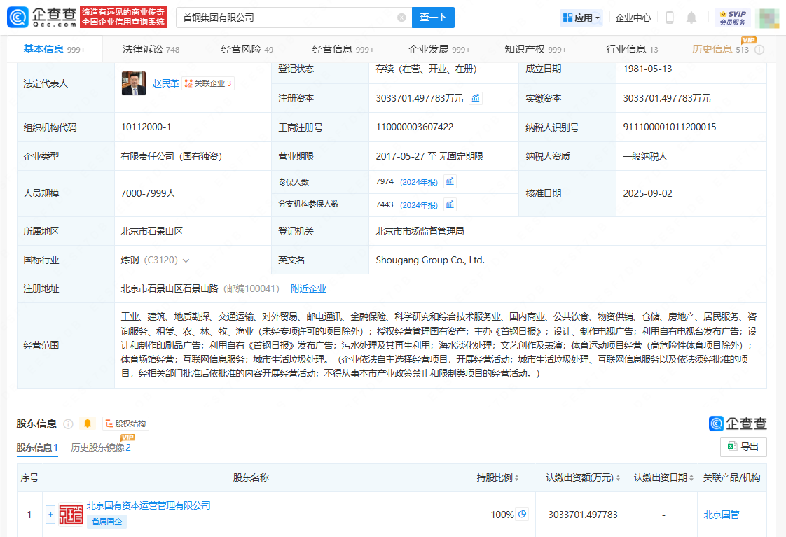 企查查APP显示,近日,首钢集团有限公司发生工商变更,注册资本由约287.55亿人民币增至约303.37亿人民币,同时多位主要人员发生变更。企查查信息显示,该公司成立于1981年5月,法定代表人为赵民革,经营范围涉及工业、建筑、地质勘探、交通运输、对外贸易、邮电通讯、金融保险、科学研究和综合技术服务业、国内商业、公共饮食等,由北京国有资本运营管理有限公司全资持股。