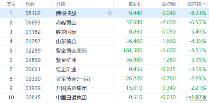 港股市场中,港银控股、赤峰黄金领跌,灵宝黄金、山东黄金、紫金矿业等多股跟跌。