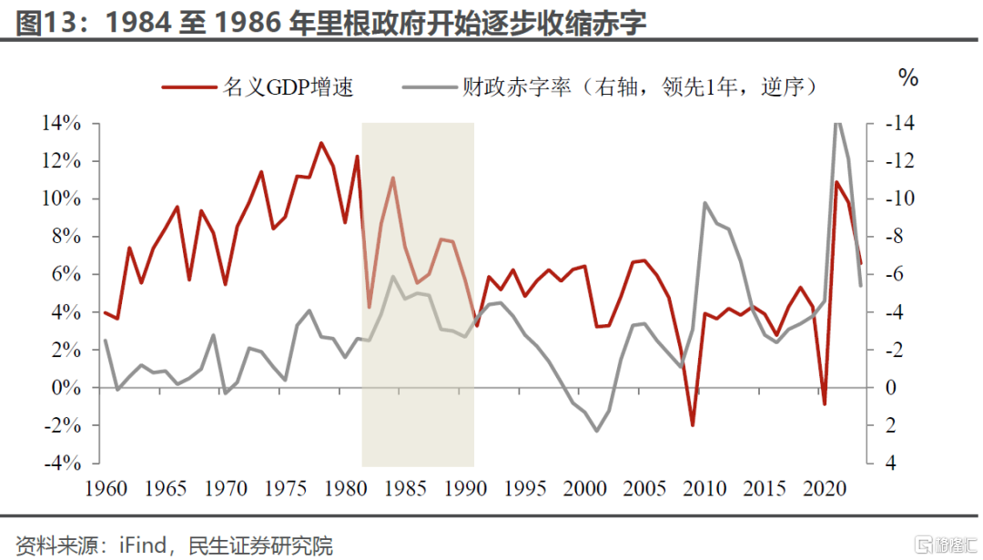 再往前,里跟总统时期也曾经出现过无衰退大幅降息。1984年至1986年美联储累计降息超过500bp,房贷利率相应大幅下降,期间房价上涨超过23%,成屋销量大增36%。但当时也是有特殊背景:1)里根政府开始逐步收缩财政赤字;2)美元处于强势升值周期。这些都使得经济增速承受压力,通胀则持续回落。