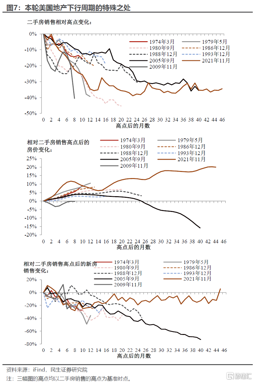 首先,回顾本轮美国地产下行周期。和历史相比,本次调整最大的不同是持续的时间比较长,从2021年11月以来已经持续4年了,虽然二手房销售下降的幅度能够和2008年金融危机前后相比,但比较特殊的是,同期新房销售却表现出异常的韧性,而房价更是明显上涨。