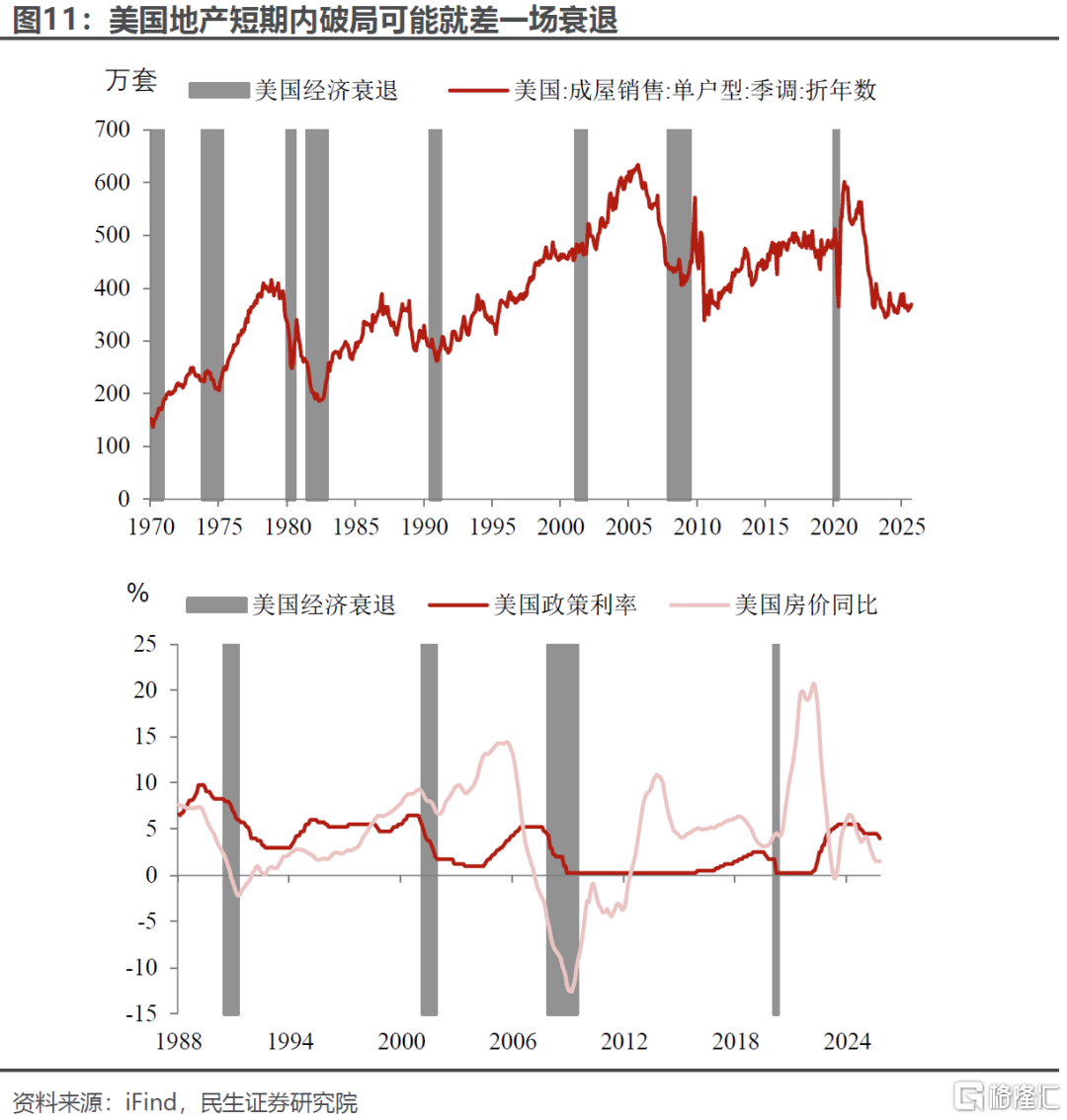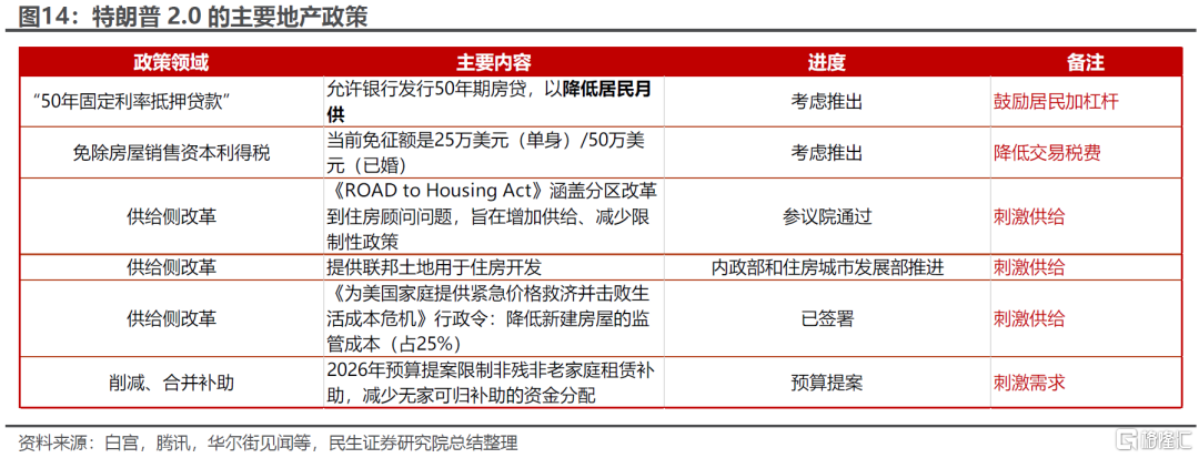 从更中长期的角度,特朗普的政策思路已经点明了方向:用时间换空间,注重供给侧改革,让居民加杠杆。通过解除供给端的约束、减少限制性的政策和监管来促进房屋供给,考虑推出类似50年期房贷(降低月供)来引导居民加杠杆。但这个过程需要时间,尤其是当前美国地产商还面临着关税挤压和需求偏弱的双重挤压。