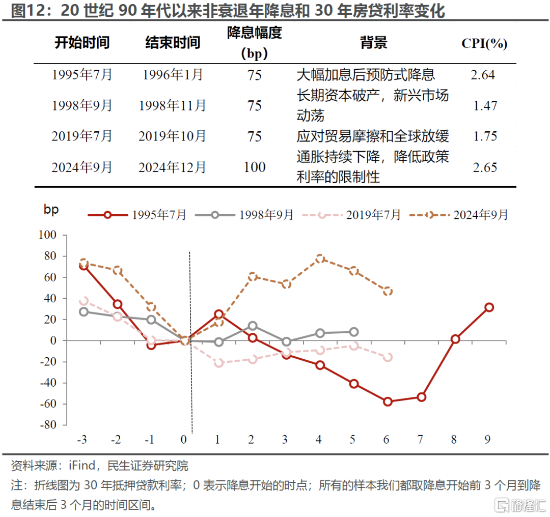 那么没有衰退,能不能强行大幅降息来破局?这个很难,难点在于从短端向长端的传导。首先基准情形下明年美国衰退的概率偏低(毕竟明年是中期选举年)。20世纪90年代以来,在不衰退的年份,美联储降息幅度通常不会超过100bp,而且由于经济底子往往不错,降息的时间一般也不长(六个月之内),我们把降息前后3个月作为一个完整的周期来看,这个周期中30年房贷利率的下降幅度往往是要小于降息幅度。唯一的期间下降幅度比较大的例子是1995年中至1996年,但是当时的特殊背景是美元进入升值周期,以及克林顿总统时期美国财政是偏紧缩的。