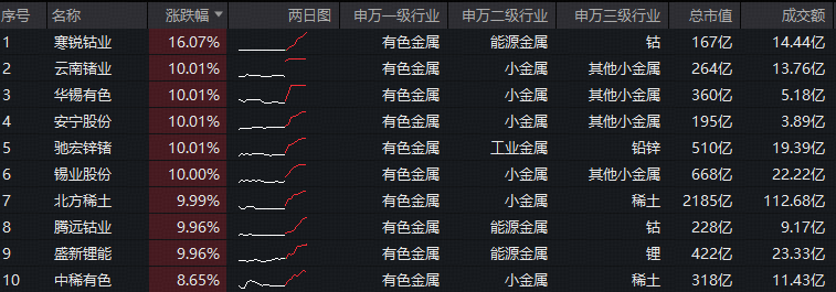 成份股方面,小金属狂掀涨停潮,华锡有色、云南锗业、安宁股份、锡业股份、北方稀土、中稀有色6股涨停。此外,驰宏锌锗涨停,寒锐钴业涨超16%