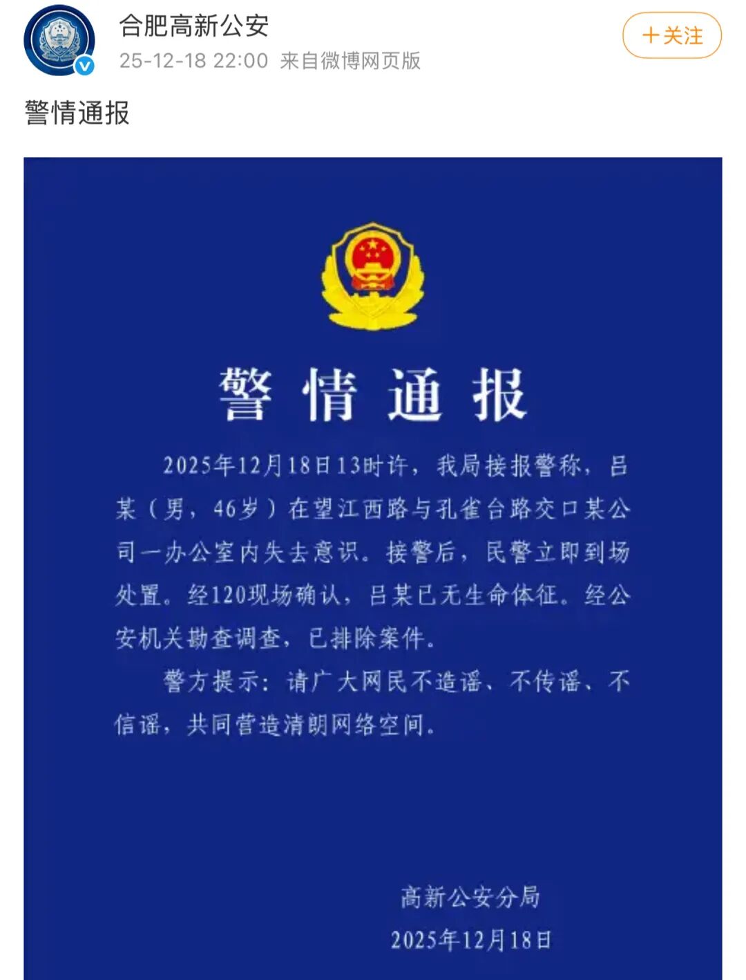 此前,合肥市高新公安分局发布警情通报:“2025年12月18日13时许,我局接报警称,吕某(男,46岁)在望江西路与孔雀台路交口某公司一办公室内失去意识,接警后,民警立即到场处置。经120现场确认,吕某已无生命体征。经公安机关勘查调查,已排除案件。”