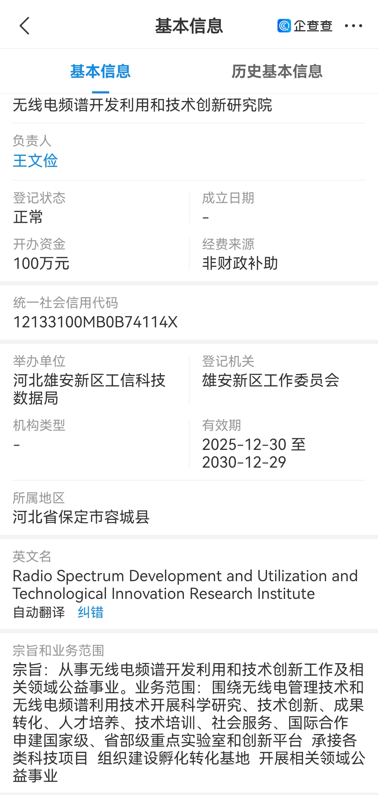 企查查APP显示,其全称为无线电频谱开发利用和技术创新研究院,位于雄安新区,举办单位为河北雄安新区工信科技数据局。宗旨为从事无线电频谱开发利用和技术创新工作及相关领域公益事业,其业务范围包含:围绕无线电管理技术和无线电频谱利用技术开展科学研究、技术创新、成果转化、人才培养等;申建国家级、省部级重点实验室和创新平台;承接各类科技项目;组织建设孵化转化基地;开展相关领域公益事业。