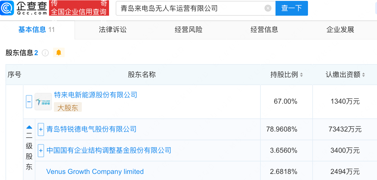 企查查APP显示,近日,青岛来电岛无人车运营有限公司成立,注册资本2000万元,经营范围包含:电动汽车充电基础设施运营;集中式快速充电站;机动车充电销售;充电桩销售等。企查查股权穿透显示,该公司由特锐德(300001)旗下特来电新能源股份有限公司、新石器慧通(北京)科技有限公司共同持股。