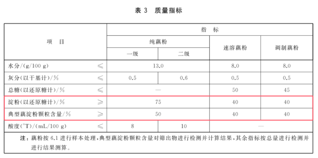 GB/T 25733 - 2022是推荐性国标,根据藕粉含量及加工工艺不同分为纯藕粉(等级有一级和二级)、速溶藕粉、调制藕粉。该标准明确要求纯藕粉的典型藕淀粉颗粒含量≥50%,速溶藕粉、调制藕粉≥40%。