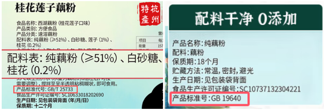 其中GB 19640 - 2016是强制性国标,该标准具有普适性,适用范围包括但不限于麦片、芝麻糊、莲子羮、藕粉、杂豆糊、粥等冲调谷物制品。该标准对产品中特定原料(如藕粉)的含量比例未设立下限要求,也未体现原料差异性。