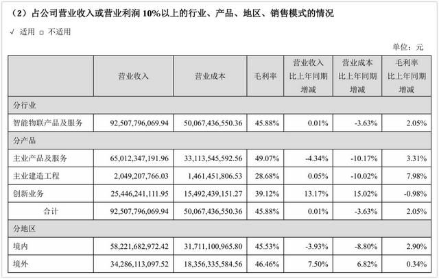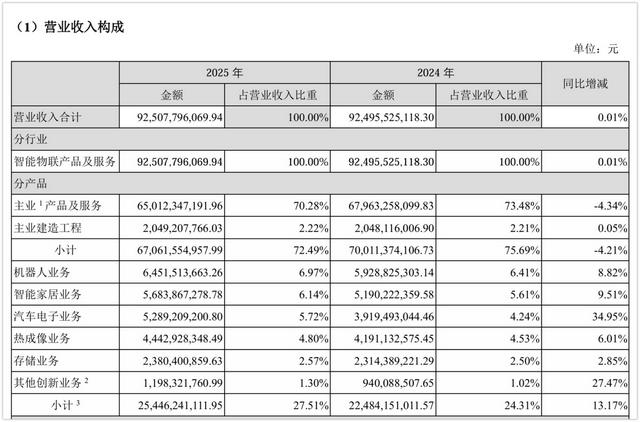 2025年,海康主业产品及服务收入为650.12亿元,占总营收的比重约七成,毛利率接近五成。这仍然是公司的现金牛,是利润的基础盘。但主业占比已经从前一年的73.5%缓慢下降,给创新板块留出了空间。