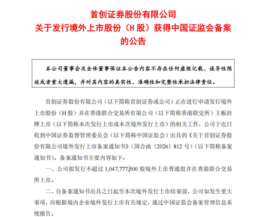 蓝鲸新闻4月17日讯(记者 陈晓娟)日前,首创证券(601136.SH)公告称,公司于近日收到证监会出具的《关于首创证券股份有限公司境外发行上市备案通知书》。其赴港上市迎来新进展。