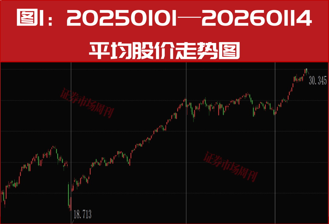 通过图1可以看到,平均股价从2024年年末的24.57最高涨到2026年1月14日的30.34,涨幅超过百分之50%,若从当年最低点18.71算起则超过了59%,说2025年是中国股市大年实至名归。