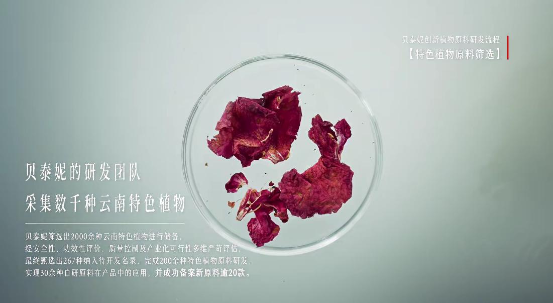 贝泰妮诞生于云南,其境内生活的高等植物种数超19000种,占全国半数以上。因此贝泰妮从云南植物王国的天然禀赋出发,自己采集植物、筛选高活性成分并对此进行筛选、评估、原料研发和备案,而非直接从供应商目录里选择现成的。这是一个从0到1的过程,贝泰妮将此定义为“源创力”。