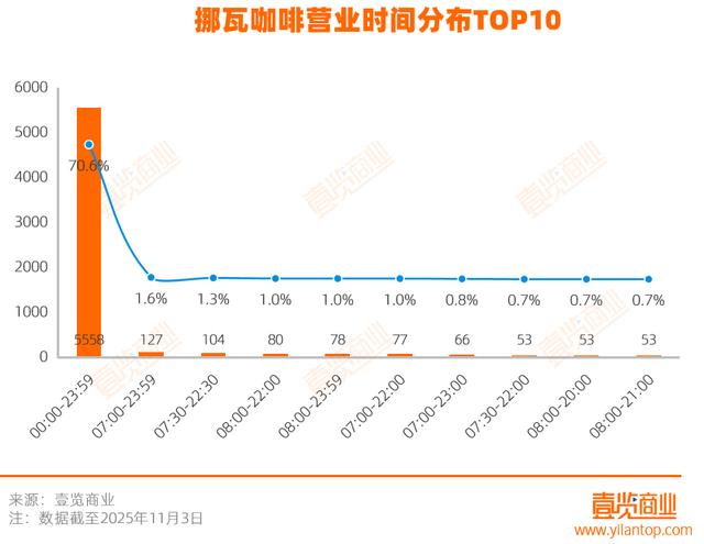 寄生模式的价值不仅体现在空间布局上,更延伸至营业时间层面。壹览商业数据显示,截至11月3日,在挪瓦咖啡所有门店中,营业时长为24小时的门店数量最多,共计5561家,占总数的70.6%,居于绝对主导地位;其次为07:00—23:59的时段,覆盖127家门店,占比1.6%。