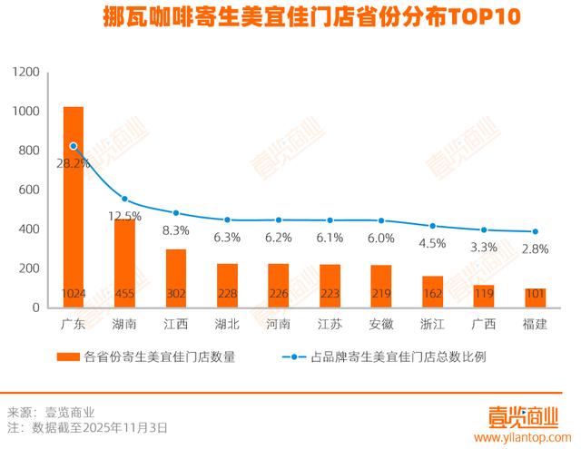 这种深度绑定,还体现在地域分布上。 在寄生美宜佳的挪瓦咖啡门店中,有1024家位于广东省,占合作门店总数的28.1%,与美宜佳在广东拥有超2万家门店的区域密度高度吻合。