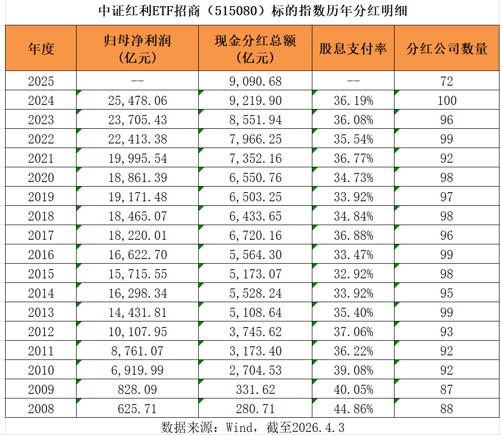 从成份股分红数据来看,中证红利指数已有72家成份股披露2025年分红方案,累计现金分红总额达9091亿元,其中16家公司分红超100亿元、14家超200亿。