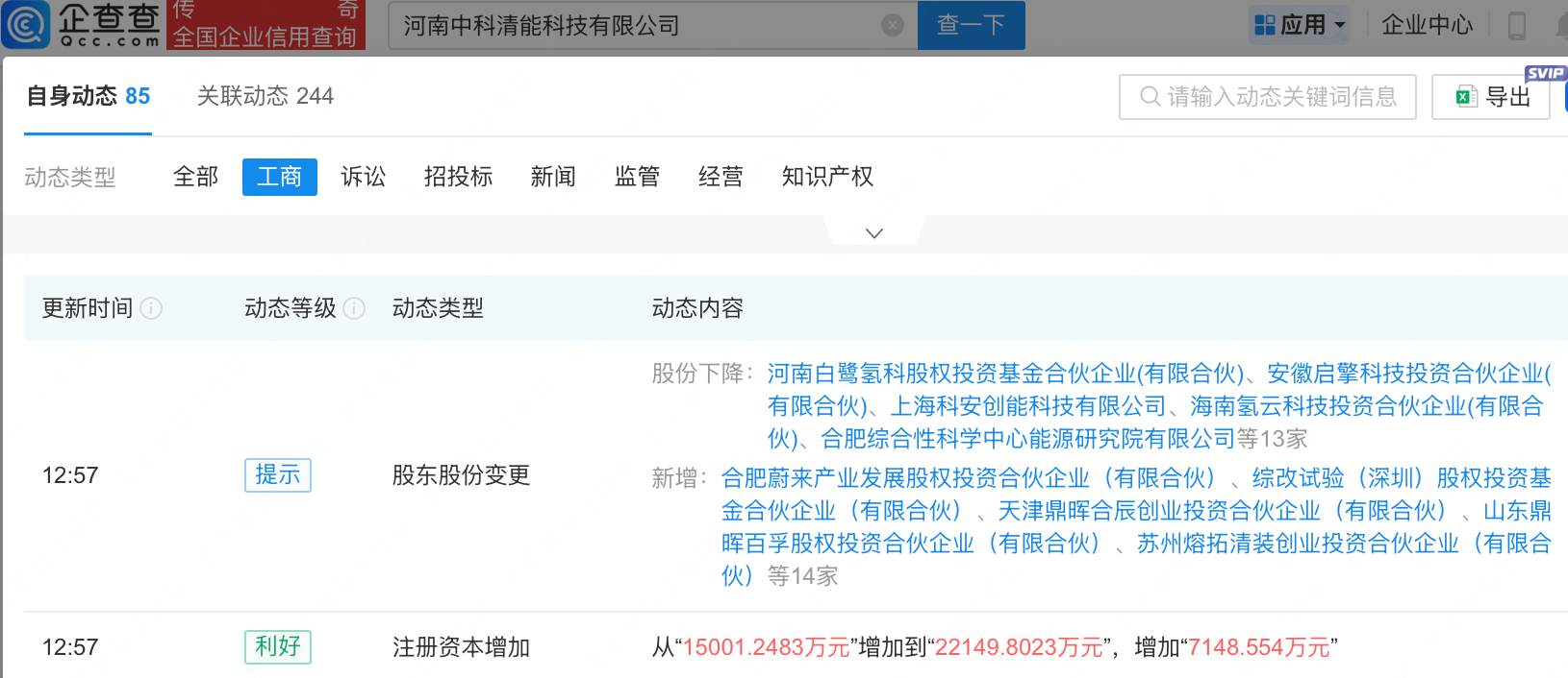 企查查APP显示,近日,河南中科清能科技有限公司发生工商变更,新增蔚来资本旗下合肥蔚来产业发展股权投资合伙企业(有限合伙)等为股东,同时注册资本增至2.21亿元。企查查信息显示,该公司成立于2022年,经营范围包含:资源再生利用技术研发;资源循环利用服务技术咨询;碳减排、碳转化、碳捕捉、碳封存技术研发等。据其官网,中科清能专注于氢液化、氦液化、深低温感知系统等低温领域装备研发、制造及产业链运营。