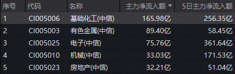 资金面上,基础化工板块近日获主力资金大举涌入。数据显示,截至收盘,基础化工板块单日获主力资金净流入165.98亿元,净流入额在30个中信一级行业中高居首位;近5日,基础化工板块累计吸金额更是高达256亿元,吸金额在30个中信一级行业中位居第2