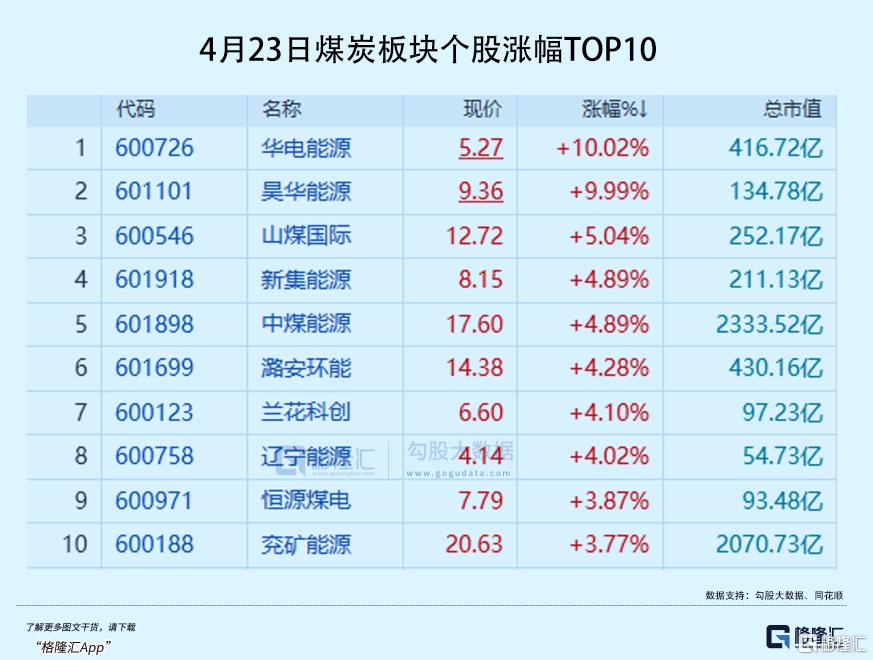 4月23日,A股整体震荡下跌,市场超4000只个股下跌,而煤炭板块却逆势走强,昊华能源、华电能源双双涨停,中煤能源涨超5%,潞安环能、兰花科创等个股跟涨明显。