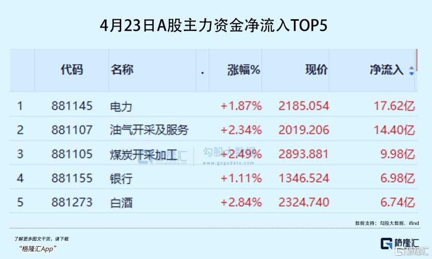 从资金流向数据来看,4月23日,电力、油气开采及服务、煤炭三大板块获得主力资金明显流入,为A股当日资金净流入前三大板块。
