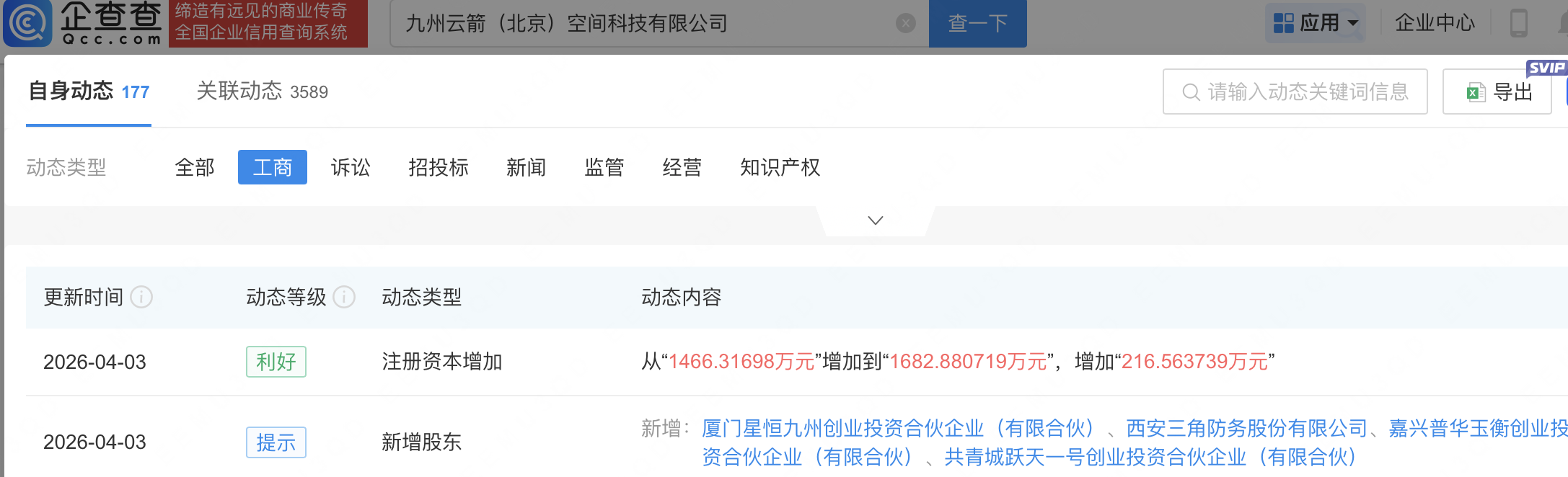 企查查APP显示,近日,九州云箭(北京)空间科技有限公司发生工商变更,新增三角防务(300775)等为股东,同时注册资本增至1682.88万元。企查查信息显示,该公司成立于2017年,经营范围包含:新材料技术推广服务;工程和技术研究和试验发展;火箭发动机研发与制造等。据其官网,该公司集液体火箭发动机设计研发、装配测试、配套飞行全流程服务为一体。
