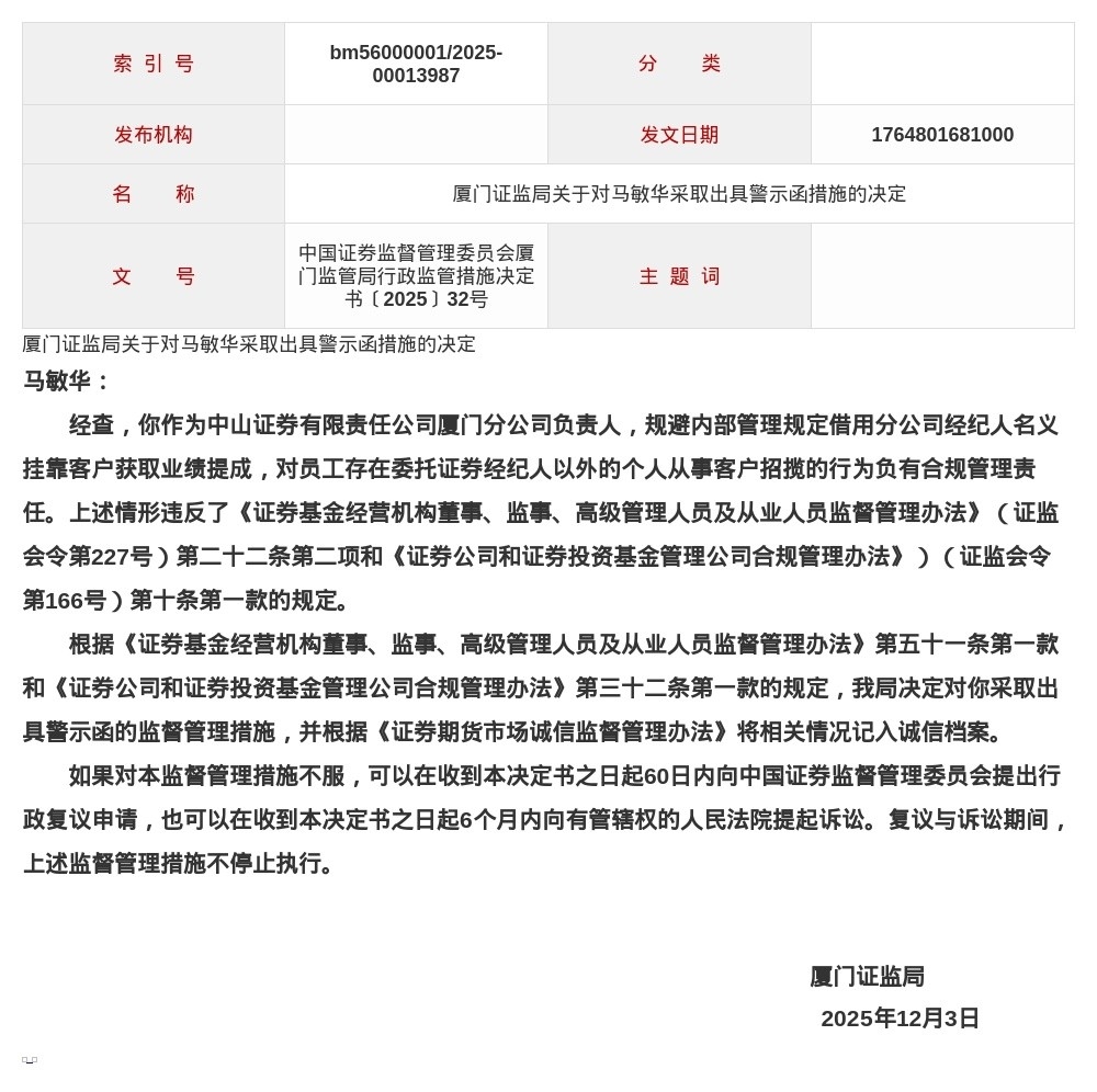 此外,马敏华作为中山证券有限责任公司厦门分公司负责人,规避内部管理规定借用分公司经纪人名义挂靠客户获取业绩提成,对员工存在委托证券经纪人以外的个人从事客户招揽的行为负有合规管理责任。违反了《证券基金经营机构董事、监事、高级管理人员及从业人员监督管理办法》《证券公司和证券投资基金管理公司合规管理办法》的相关规定,被出具警示函,并将相关情况记入诚信档案。