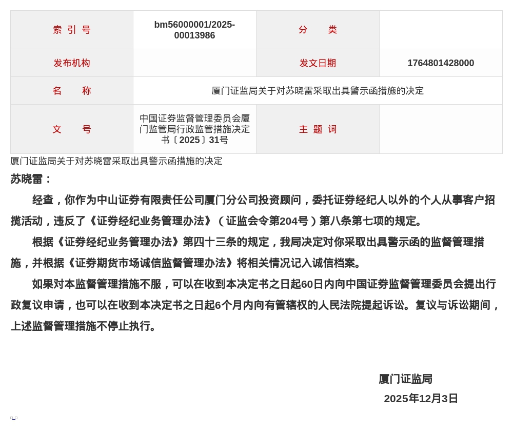 蓝鲸新闻12月4日讯,近日,厦门证监局发布了一则行政监管措施决定书,剑指中山证券有限责任公司厦门分公司及其相关责任人。