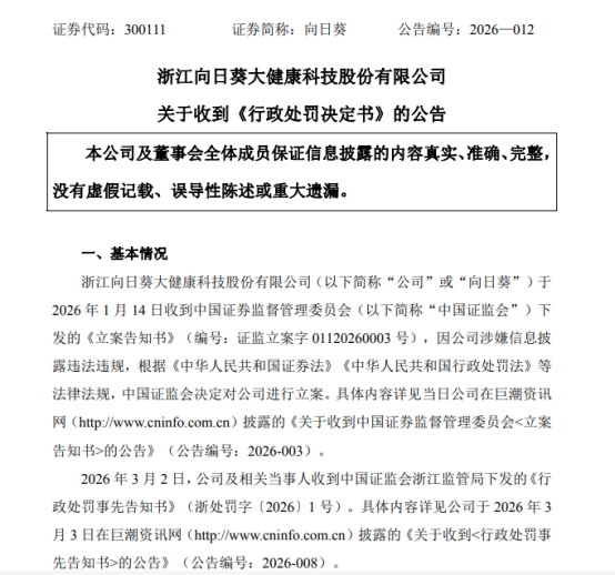2026年4月8日晚,浙江向日葵大健康科技股份有限公司(下称:向日葵,300111.SZ)公告因重大资产重组预案存在误导性陈述,公司及相关当事人被中国证监会浙江监管局合计罚款510万元。这一事件并非孤立的合规失误,其背后是公司在主业增长乏力、转型屡屡受挫的背景下,试图通过“蹭热点”来粉饰业绩、维系估值的深层博弈。公告发出后,向日葵股价下跌,截止4月9日收盘,向日葵股价下跌4.6%。