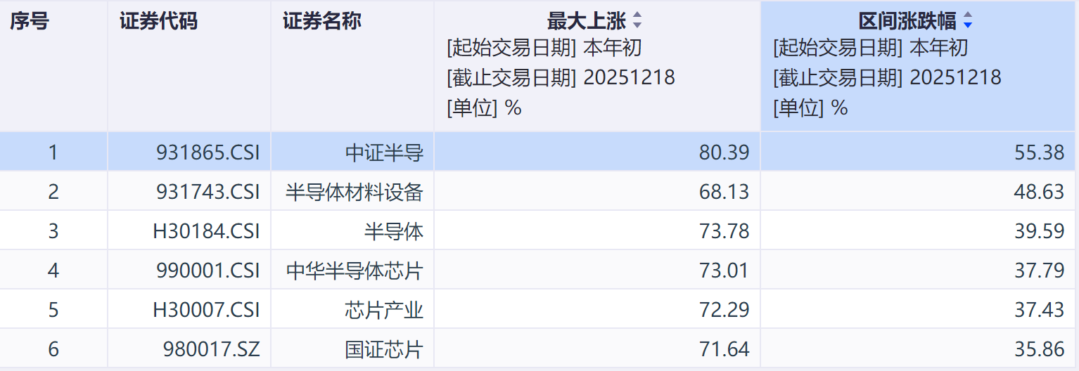 我查了一下,目前场内重仓半导体设备(含量在50%以上)的指数中,中证半导的年内涨幅和最大涨幅是最高的。这说明这个指数弹性比较突出,更适合在半导体上行周期中布局设备还有其他卖铲子领域,比如材料、设计等。