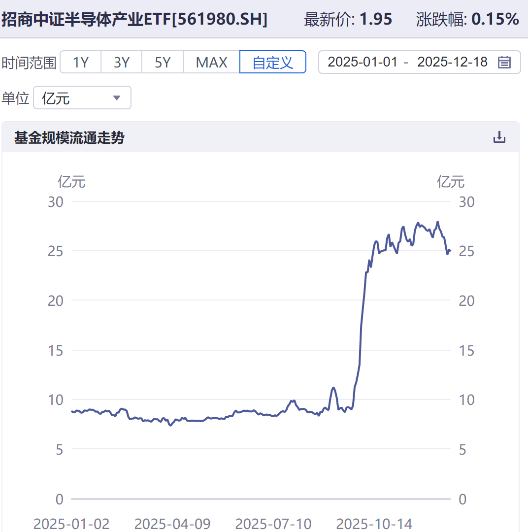 目前半导体设备ETF(561980)是场内跟踪指数较早的ETF,最新年内涨幅超过56%,年初规模不足5亿,现在规模已经25亿了,直接翻了5倍。说明今年的半导体叙事中,大家还是很认可这块的,对2026拭目以待了。