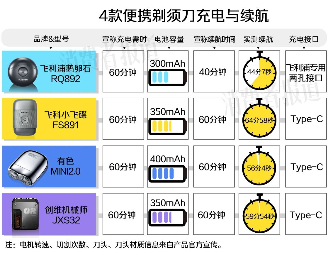 从4款便携剃须刀标称的电量参数和续航时间来看,3款国产产品更有优势:电池容量均在350mAh以上,续航时间达60分钟。而飞利浦鹅卵石个头最大,电池容量却最小,仅300mAh,续航时长也只有40分钟,这也是飞利浦中端产品线被诟病较多的一点。