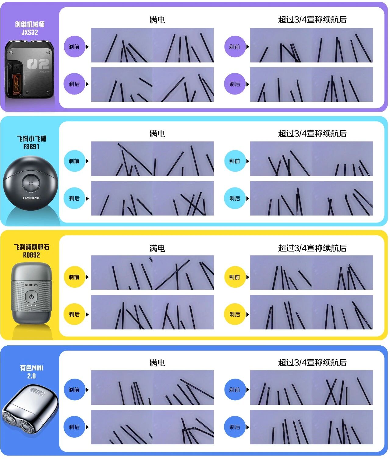 整体来看,4款便携剃须刀的锋利度都不错,即便在低电量状态下仍保持较好的切割效果,在一定程度上打破了“电量下降导致剃须效果下降”的说法。究其原因,现在电动剃须刀普遍采用了恒速电机,能有效降低电量不足对剃须效果的影响。