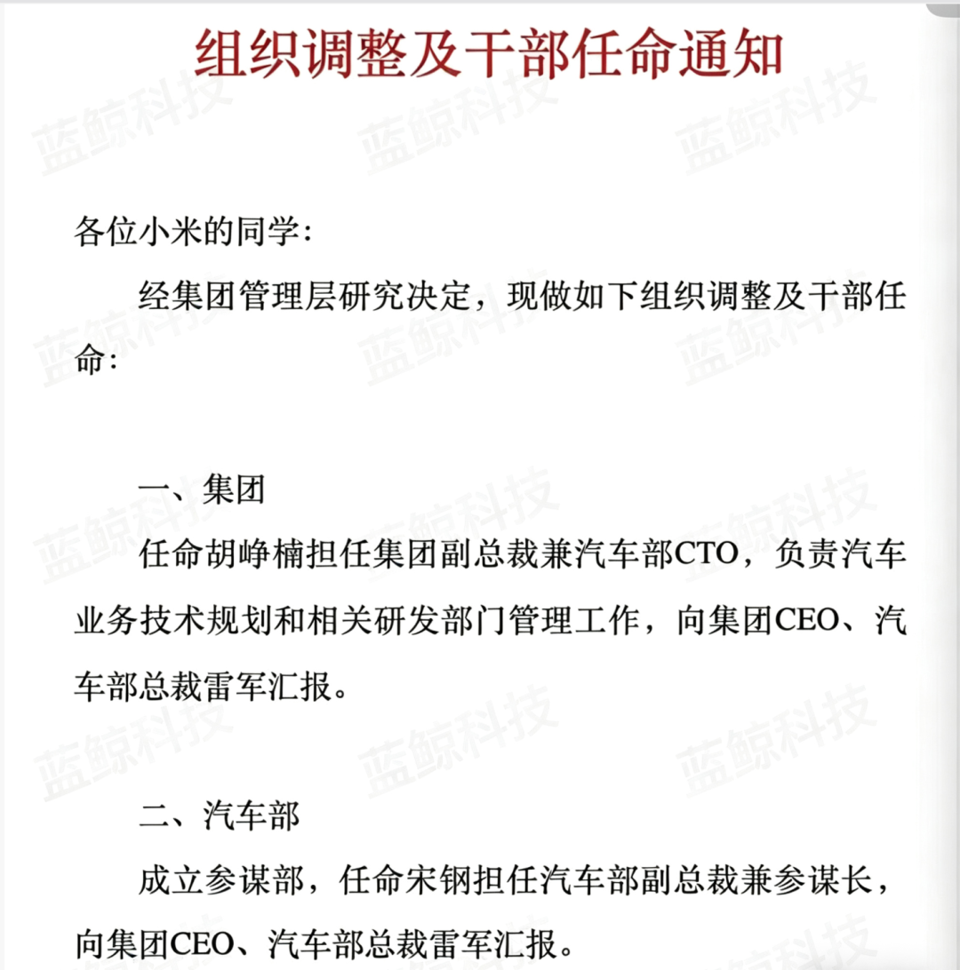 蓝鲸新闻4月17日讯(记者 翟智超)蓝鲸科技记者获悉,今日小米集团发布内部邮件宣布两项重要人事任命:胡峥楠出任小米集团副总裁、汽车部 CTO;宋钢出任小米集团汽车部副总裁、参谋长。