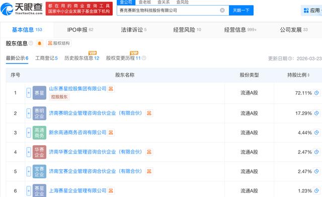 天眼查App信息显示,赛克赛斯成立于2003年6月,前身为山东赛克赛斯药业科技有限公司。目前,该公司的注册资本约为3.33亿元,法定代表人为邹方明,主要股东包括山东赛星、济南赛明等。
