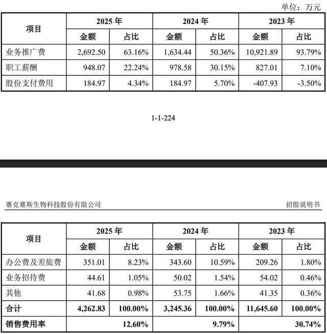 而早前招股书显示,赛克赛斯2020年、2021年和2022年的销售费用分别约为2.14亿元、1.84亿元和1.21亿元,销售费用率分别为49.02%、42.29%和31.76%。