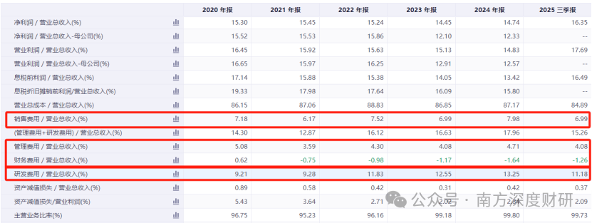销售净利率近年呈回升趋势,尤其是在2025年毛利率下滑的情况下,净利率反而大幅提升,主要是研发费用节约了近2个百分点。