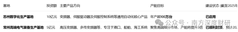 根据公司在建工程转固情况来看,2025年三季报,公司固定资产大幅增长166%。主要是苏州数字化生产基地转固,目前已经进入投产倒计时。该基地定位“通用自动化核心部件生产”,建成后预计年产变频器、伺服驱动器及伺服控制系统等产品超100万台,相当于2024年公司核心产品总产量翻1倍;