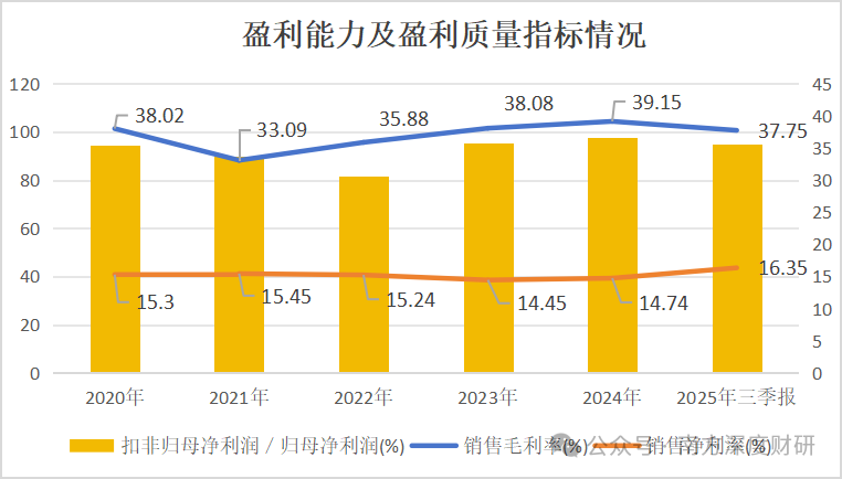 从毛利率来看,近几年平均毛利率在37%左右,2023年至今处于波动中回升,说明公司产品溢价或产业链议价能力上表现较好;从盈利质量(扣非归母净利润/归母净利润)指标来看,平均保持在90%以上,说明公司净利润主要由主营业务驱动,盈利质量较为扎实;
